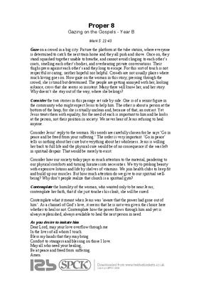 Gaze on a crowd in a big city. Picture the platform at the tube station, where everyone is determined to catch the next train home and they all push and shove. Once on, they stand squashed together unable to breathe, and cannot avoid clinging to each other’s coats, smelling each other’s bodies, and overhearing private conversations. Their thighs press against each other’s and they long to escape. For this sort of touch is not respectful or caring; neither hopeful nor helpful. Crowds are not usually places where much loving goes on. Now gaze on the woman in this story, pressing through the crowd; she is timid but determined. The people are getting annoyed with her, looking askance, cross that she seems so insistent. Many there will know her, and her story. Why doesn’t she stay out of the way, where she belongs?...