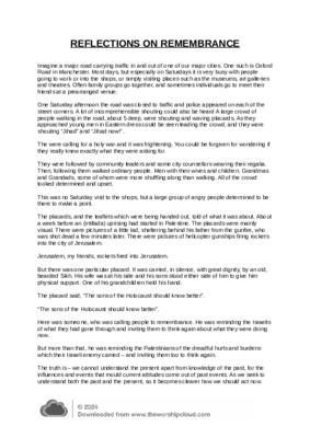 This reflection (923 words) has been successfully used as a short sermon for remembrance day. It invites us to to remember both past and present conflicts and how they affect us today. As well as the suffering of many members of our armed forces past and present, other more recent events are highlighted. The fundamental need of Christians to remember their past is also shown to be incorporated in the ceremony of Holy communion by Jesus himself.