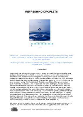 Refreshing Droplets, is a series of reflective thoughts on a variety of subjects inspired by the life-giving water Christ gives...