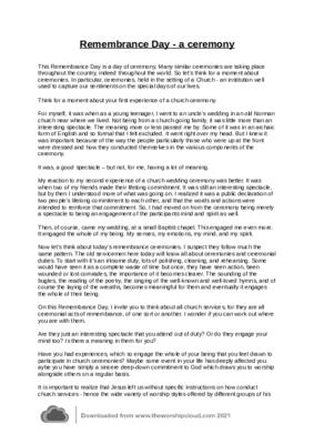 This meditation/reflection has been used, and well received, as a short sermon for Remembrance day. It is based on the ceremonial nature of Remembrance day services and explores the role of ceremonies in military life, and in a church settings. Begining by thinking about wedding ceremonies and ending with the sacrament of Holy Communion, it invites us to consider the depth of our involvement from being a mere spectacle to a worship event that engages our whole being.
