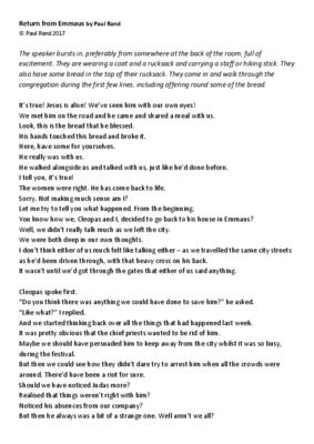 The speaker bursts in, preferably from somewhere at the back of the room, full of excitement. They are wearing a coat and a rucksack and carrying a staff or hiking stick. They also have some bread in the top of their rucksack. They come in and walk through the congregation during the first few lines, including offering round some of the bread.