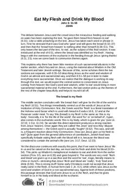 The debate between Jesus and the crowd since the miraculous feeding and walking on water has been exploring the text, ‘he gave them bread from heaven to eat’ (6:31). Like a rabbi preaching on the text, Jesus has taken each word or phrase in turn. First he stressed that it was God who ‘gave’ and still gives the bread (6:32–37) and then that the ‘bread from heaven’ is nothing other than himself (6:38–51)…