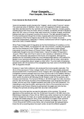 Jerome’s translation quickly became the ‘Vulgate’, which means ‘Common’ version. The canonical order of Matthew– Mark–Luke–John applied to Ezekiel’s sequence was fairly standard and the four symbols can be found in frescoes, mosaics, pulpits, crosses and so forth from the fourth century onwards. Christianity arrived in Britain by about AD 200; rooms in Roman villas were turned into Christian chapels, and British bishops took part in the great Councils of the church. The faith spread through the Province and beyond through the ministry of great saints like David and Patrick. After the departure of the Roman legions around AD 410, the Christian churches continued independently, especially in Ireland, Scotland and northern England, giving rise to the Celtic Christian tradition…