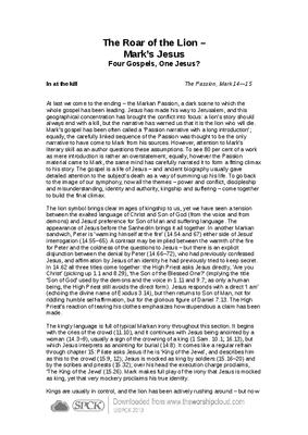 At last we come to the ending – the Markan Passion, a dark scene to which the whole gospel has been leading. Jesus has made his way to Jerusalem, and this geographical concentration has brought the conflict into focus: a lion’s story should always end with a kill, but the narrative has warned us that it is the lion who will die. Mark’s gospel has been often called a ‘Passion narrative with a long introduction’; equally, the carefully linked sequence of the Passion was thought to be the only narrative to have come to Mark from his sources. However, attention to Mark’s literary skill as an author questions these assumptions. To see 80 per cent of a work as mere introduction is rather an overstatement; equally, however the Passion material came to Mark, the same mind has carefully narrated it to form a fitting climax to his story. The gospel is a life of Jesus – and ancient biography usually gave detailed attention to the subject’s death as a way of summing up his life. To go back to the image of our symphony, now all the themes – power and conflict, discipleship and misunderstanding, identity and authority, kingship and suffering – come together to build the final climax…