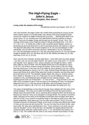 Like most animals, the eagle rushes into conflict when protecting its young, yet the same instinct causes it to exhibit tender care. Moses’ final song compares God’s concern for Israel to an eagle ‘hovering over its young . . . bearing them aloft on its wings’ (Deut. 32.11), echoing how God called Moses and the Israelites to Mount Sinai: ‘I bore you on eagles’ wings and brought you to myself ’ (Exod. 19.4). The ‘shadow of his wings’ is the Psalmist’s place of refuge and hiding (Pss. 17.8; 36.7; 57.1; 63.7; 91.1, 4). While the conflict is with unnamed Jewish leaders, there is a tremendously personal dimension to John’s portrayal of those who believe in Jesus. The disputes take place with crowds (chapters 6—8; 10), but real dialogue is with individuals, who are often otherwise unknown: Nathanael (1.45–51); Nicodemus (3.1–10); the Samaritan woman (4.7–26); the man at the pool (5.2–9, 14); the woman caught in adultery (8.9–11); the blind man (9.35–38); Martha and Mary (11.21–40); and Peter (13.6–10; 21.15–22)…