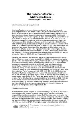 Matthew’s Teacher is concerned about moral teaching; one of his key words (occurring seven times in Matthew, once in Luke, and never in Mark) is dikaiosune, justice or righteousness, with its adjective dikaios (fifteen times in Matthew; once in Mark; ten times in Luke). Joseph is dikaios, a righteous man (1.19). Fulfilling ‘all righteousness’ is why Jesus is baptized (3.15). It is something to hunger and thirst for (5.6), and to be sought (6.33); ‘right’ behaviour is required (5.10, 20; 6.1; 21.32). While Luke blesses the hungry (Lk. 6.21), Matthew has those who are hungry for ‘righteousness’ (5.6); while Luke tells us to ‘seek his kingdom’ (Lk. 6.31), Matthew adds ‘and his righteousness’ (6.33). Our ‘righteousness’ must not be paraded before others (6.1), but it must ‘exceed that of the Pharisees’ (5.20). Each sermon ends with judgement and reward: the reward of the wise builder, and the judgement of the foolish (7.24–27); the reward of the ‘righteous’ (dikaios) in welcoming the disciples (10.40–42); weeds/wheat and good/bad fish ((7.24–27)); removing the wicked from the ‘righteous’ (13.49); the judgement of the unforgiving servant (18.21–35); and the sheep, the ‘righteous’ (25.37, 46), and the goats (25.31–46)…