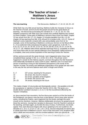 While Mark has very little actual teaching, Matthew builds the character of Jesus as the Teacher of Israel, and structures the gospel around his five great blocks of teaching – the discourses punctuating the narrative (5—7, 10, 13, 18, 23—25). Detailed comparison with Mark and Luke reveals how carefully Matthew has worked on these chapters. Some parts of Matthew’s sermons have come from Mark: chapter 10 has verses from Mk. 6.7–13; chapter 13 includes parables from Mk. 4.3–34; chapter 18 has teaching from Mk. 9.35–48 and 24 is similar to Mk. 13.5–37. Some of Matthew’s extra material is shared with Luke and probably came from Q: for example, some of the teaching in Matthew’s continuous Sermon on the Mount (Matt. 5—7) is scattered in bits and pieces throughout Luke’s gospel (Lk. 6.20–49; 7.1; 8.16; 11.2–4, 9–13, 33, 34–35; 12.22–31, 33–34, 58–59; 13.24, 25–27; 14.34–35; 16.13, 17, 18). Matthew takes these separate teachings from Q, completely re-orders and mixes them with his own special material to form beautifully crafted sermons as a complete, clear and concise exposition of the teaching of Jesus the Teacher…