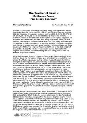 Matthew includes nearly every verse of Mark’s Passion in the same order, except little details about the young man (Mk. 4.51–52), and Simon of Cyrene’s sons (Mk. 15.21b). Only about 26 verses are unique to Matthew (26.1–2, 25, 52–54; 27.3–10, 19, 24–25, 29, 51b–53, 62–66, all discussed below). Despite this similarity, Matthew’s Passion is very different in its atmosphere. As throughout his gospel, his account is more awesome – and there is no ambiguity. Mark’s Passion narrative depicted the suffering of Jesus as the final absence of God; here it is the means of his presence, underlining the identity of Jesus. As with Mark, the Passion narrative pulls the main themes of Matthew’s gospel together: the history of Israel and God’s salvation, the fulfilment of scripture, the portrayal of Jesus as the obedient Son of God, and the final conflict with the Jewish leaders causing the transfer of the kingdom to the Gentiles. The Teacher has given his teaching; now we have his example of righteous suffering…