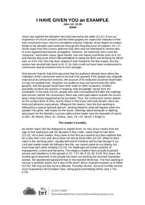 Jesus has washed the disciples’ feet and returned to the table (13:12). From our experience of church services and the other gospels we expect the institution of the holy communion next—but it is completely missing. Instead, Jesus begins to explain things to his disciples and continues through the long discourse of chapters 14—17. Some argue from this curious absence that John was not interested in communion, or even opposed sacraments all together. However, we noted that John used the ‘eucharist-’ word when Jesus ‘gave thanks’ over the loaves and fishes (see on 6:11) and that the discourse which followed talked of eating his flesh and drinking his blood (see on 6:51–59). Not only does chapter 6 look forward to the last supper, but this section has several links back to ch. 6. So John could not have been uninterested in communion and its omission here is even stranger…