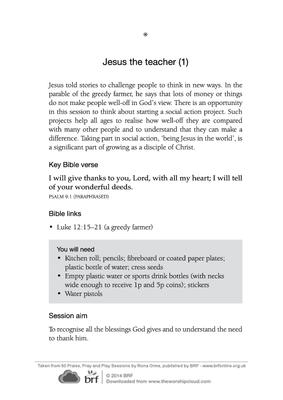 Jesus told stories to challenge people to think in new ways. In the parable of the greedy farmer, he says that lots of money or things do not make people well-off in God's view. There is an opportunity in this session to think about starting a social action project. Such projects help all ages to realise how well-off they are compared with many other people and to understand that they can make a difference. Taking part in social action, 'being Jesus in the world', is a significant part of growing as a disciple of Christ.