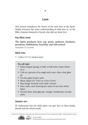 This session introduces the theme of the nine fruit of the Spirit. Nearly everyone has some understanding of what love is, so the Bible character featured is Herod, who did not show love.