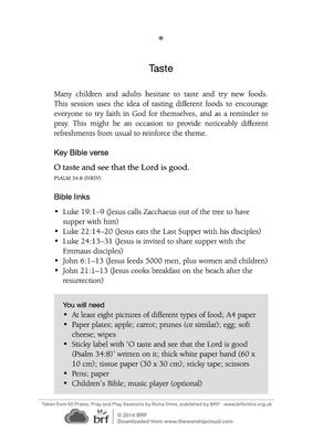 Many children and adults hesitate to taste and try new foods. This session uses the idea of tasting different foods to encourage everyone to try faith in God for themselves, and as a reminder to pray. This might be an occasion to provide noticeably different refreshments from usual to reinforce the theme.