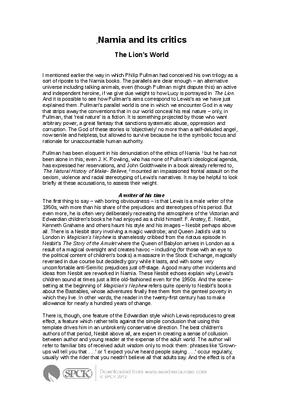 I mentioned earlier the way in which Philip Pullman had conceived his own trilogy as a sort of riposte to the Narnia books. The parallels are clear enough – an alternative universe including talking animals, even (though Pullman might dispute this) an active and independent heroine, if we give due weight to how Lucy is portrayed in The Lion. And it is possible to see how Pullman’s aims correspond to Lewis’s as we have just explained them. Pullman’s parallel world is one in which we encounter God in a way that strips away the conventions that in our world conceal his real nature – only, in Pullman, that ‘real nature’ is a fiction. It is something projected by those who want arbitrary power, a great fantasy that sanctions systematic abuse, oppression and corruption. The God of these stories is ‘objectively’ no more than a self-deluded angel, now senile and helpless, but allowed to survive because he is the symbolic focus and rationale for unaccountable human authority...