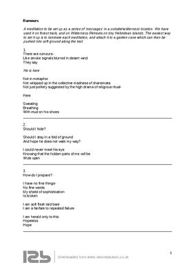 A meditation to be set up as a series of 'messages' 12 in total) in a outside/wilderness location. We have used it on forest trails, and on Wilderness Retreats on tiny Hebridean islands. The easiest way to set it up is to laminate each meditation, and attach it to a garden cane which can then be pushed into soft ground along the trail.