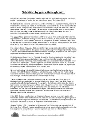Based on Ephesians 2:8,9, this reflection/short sermon (1217 words) considers salvation and its relationship to God's grace and our faith. The implications are also explored and a brief outline of how this gospel has been misinterpreted historically is given.