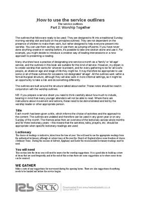 The outlines that follow are ready to be used. They are designed to fit into a traditional Sunday morning worship slot and build on the principles outlined. They are not dependent on the presence of children to make them work, but rather designed to help everyone present into worship. You can use them as they are or use them as jumping-off points. If you have never done anything creative in worship before, it’s possible to take one section alone and use it. For example, you might decide to introduce a creative way of leading intercessions or a new approach to presenting a reading...