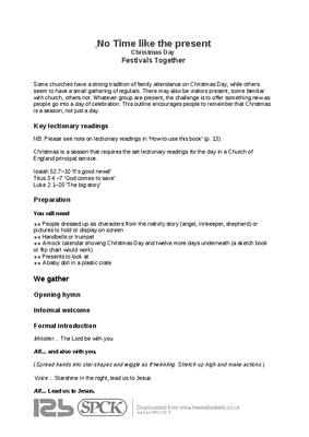 Some churches have a strong tradition of family attendance on Christmas Day, while others seem to have a small gathering of regulars. There may also be visitors present, some familiar with church, others not. Whatever group are present, the challenge is to offer something new as people go into a day of celebration. This outline encourages people to remember that Christmas is a season, not just a day...
