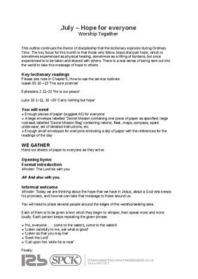 This outline continues the theme of discipleship that the lectionary explores during Ordinary Time. The key focus for this month is that those who follow Jesus discover hope, which is sometimes experienced as physical healing, sometimes as a lifting of burdens, but once experienced is to be taken and shared with others. There is a real sense of being sent out into the world to take this message of hope to others...