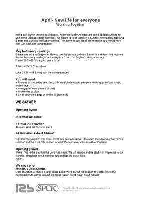 In the companion volume to this book, Festivals Together, there are some special outlines for use at the various Easter festivals. This outline is to be used on a Sunday immediately following Easter and picks up on Easter themes. The activities and ideas are reflective and would work well with a smaller congregation...