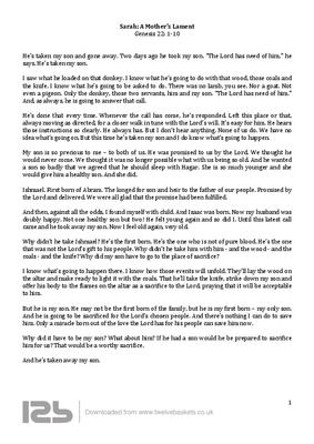 This is one of a number of monologues that I have written for use in worship or some other reflective purpose. This one deals with the events of Genesis 22: 1-10 from the point of view of Sarah.