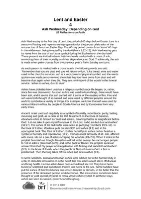 Ash Wednesday is the first day of Lent, the period of 40 days before Easter. Lent is a season of fasting and repentance in preparation for the joyous celebration of the resurrection of Jesus on Easter Day. The 40-day period comes from Jesus’ 40 days in the wilderness, being tempted by the devil (Mark 1:12–13). Ash Wednesday gets its name from the use of ash as a symbol during the Eucharist on the day itself. Those present are invited to have their foreheads marked with a cross of ash, reminding them of their mortality and their dependence on God. Traditionally, the ash is made when palm crosses from the previous year’s Palm Sunday are burnt…