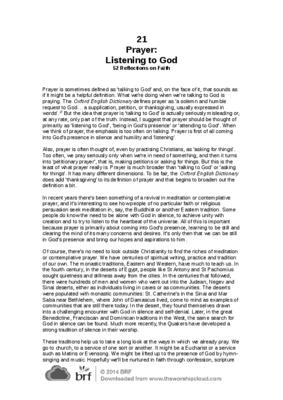Prayer is sometimes defined as ‘talking to God’ and, on the face of it, that sounds as if it might be a helpful definition. What we’re doing when we’re talking to God is praying. The Oxford English Dictionary defines prayer as ‘a solemn and humble request to God… a supplication, petition, or thanksgiving, usually expressed in words’.17 But the idea that prayer is ‘talking to God’ is actually seriously misleading or, at any rate, only part of the truth. Instead, I suggest that prayer should be thought of primarily as ‘listening to God’, ‘being in God’s presence’ or ‘attending to God’. When we think of prayer, the emphasis is too often on talking. Prayer is first of all coming into God’s presence in silence and humility and ‘listening’…