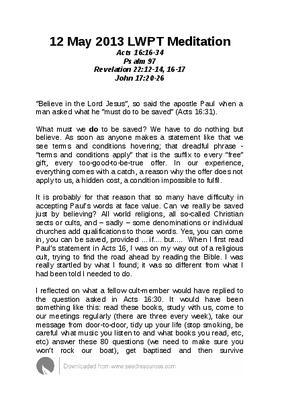 What must we do to be saved? We have to do nothing but believe. As soon as anyone makes a statement like that we see terms and conditions hovering; that dreadful phrase - “terms and conditions apply” that is the suffix to every “free” gift, every too-good-to-be-true offer. In our experience, everything comes with a catch, a reason why the offer does not apply to us, a hidden cost, a condition impossible to fulfil...