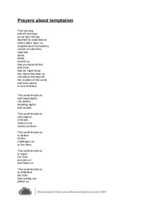 Prayers for times of temptation, looking to Jesus as our example to overcome. The world tempts us in many ways, in fact it tempts us to believe that we cannot resist, when we know in our hearts that with God's help we can.