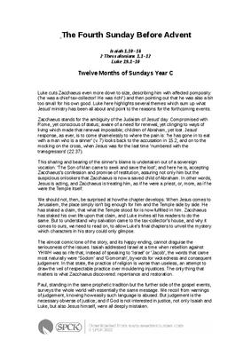 Zacchaeus stands for the ambiguity of the Judaism of Jesus’ day. Compromised with Rome, yet conscious of status; aware of a need for renewal, yet clinging to ways of living which made that renewal impossible; children of Abraham, yet lost. Jesus’ response, as ever, is to come shamelessly to where the pain is: ‘he has gone in to eat with a man who is a sinner’ (v. 7) looks back to the accusation in 15.2, and on to the mocking on the cross, when Jesus was for the last time ‘numbered with the transgressors’ (22.37)...