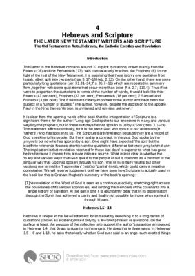 The Letter to the Hebrews contains around 37 explicit quotations, drawn mainly from the Psalms (16) and the Pentateuch (13), with comparatively few from the Prophets (6). In the light of the rest of the New Testament, it is surprising that there is only one quotation from Isaiah, albeit split into two parts (Isa. 8.17–18/Heb. 2.13). On the other hand, there are some particularly long quotations (Jer. 31.31–34; Ps. 95.7–11) which are repeated in summary form, together with some quotations that occur more than once (Ps. 2.7; 110.4). Thus if we were to proportion the quotations in terms of the number of words, it would look like this: Psalms (47 per cent); Prophets (32 per cent); Pentateuch (18 per cent); 2 Samuel and Proverbs (3 per cent). The Psalms are clearly important to the author and have been the