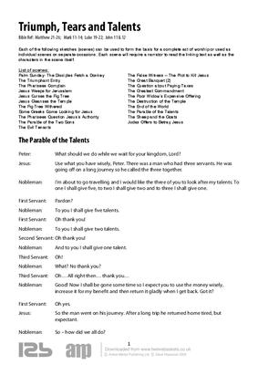 Each of the following sketches (scenes) can be used to form the basis for a complete act of worship or used as individual scenes on separate occasions. Each scene will require a narrator to read the linking text as well as the characters in the scene itself.