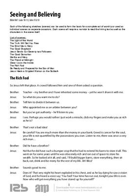 Each of the following sketches (scenes) can be used to form the basis for a complete act of worship or used as individual scenes on separate occasions. Each scene will require a narrator to read the linking text as well as the characters in the scene itself.