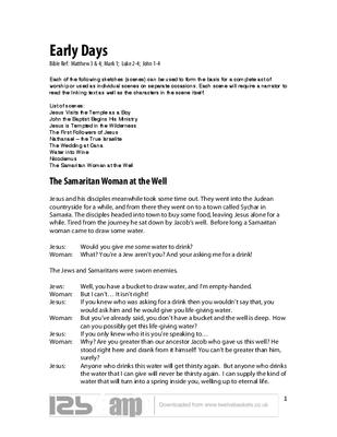 Each of the following sketches (scenes) can be used to form the basis for a complete act of worship or used as individual scenes on separate occasions. Each scene will require a narrator to read the linking text as well as the characters in the scene itself.