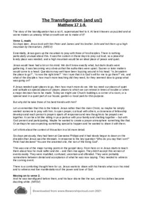 This reflection explores the events surrounding the transfiguration and their meaning for Jesus and his disciples. Its implication for believers today are also explored. It has been used successfully as a short sermon. (1203 words)