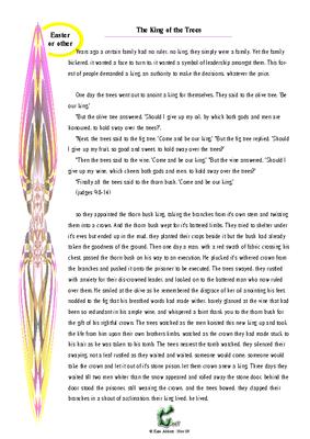 Suitable for other points in the year the King of the trees is a reflecton based on Judges 9:8-14 and carries on the stories of the fig, olive, vine and thorn as they come to play their part in the story of Jesus.