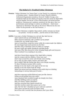 ‘Father Christmas’ (or ‘Santa Claus’, or just ‘Santa’) is a mainstay of many a Christmas party – Sunday School (or Junior Church) children, Uniformed Organisation members, Parent & Toddler Groups, even Luncheon Clubs for the elderly all eagerly await the sound of Jingle Bells and the familiar ‘Ho-ho-ho!’ of the white-bearded, red-suited present- profferor. Choosing one’s audience sensitively for this piece, here is a performance poem perhaps to redress an imbalance...