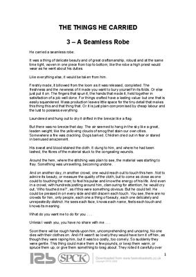 It was a thing of delicate beauty and of great craftsmanship, robust and at the same time light, woven in one piece from top to bottom; like the robe a high priest would wear as he went about his duties. Like everything else, it would be taken from him. Freshly made, it billowed from the loom as it was released, completed. The freshness and the newness of it made you want to bury yourself in its folds. Or else just