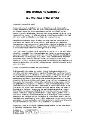 He carried the harsh words that I reserve for those I love most. He carried the bruising resentfulness of my pride. He carried every one of the petty excuses that I use to defend myself. He carried the puffed-up charade of my vanity: my self- importance and my self-reliance. He carried every wrong decision I have ever made. He carried those moments of wilful wrong-doing, where I have stared down the right path, seen what it would cost me, and chosen the easy road instead. He carried the time I took...