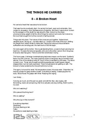 That was how he eventually died. He carried his heart, open and vulnerable, from Jordan to Jerusalem, from Gethsemane to Golgotha. And then it was broken: broken by the savagery of the death he was about to face; broken by the sheer, uncompromising weight of all the other