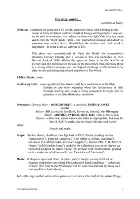 A serious Drama around the power of words. An all-age piece with twin foci: one on Literacy Hour in an English school where word games are played to aid learning, contrasted with Third World villagers whose poor grasp of written English facilitates their exploitation. Words are a matter of life and death - to whom shall we go? It may usefully be followed by a time of reflection aided by gentle music.