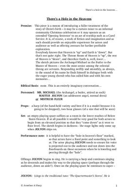 In the drama the Archangel Michael, Butler to the Master of Heaven, responds swiftly to the sound of his name and finds himself in dialogue both with the young cherub who has called out in panic at having discovered "a hole in the heavens" and with his own memories…