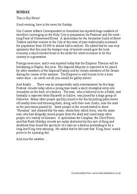 And finally There was an unexpectedly early entertainment for the large Festival crowds today when a young man made a mock-triumphal entry into Jerusalem on the back of a donkey. The man, who is believed to be a Rabbi, and formally a carpenter from Nazareth in Galilee, was joined by a large group of followers. Many other people quickly joined in the fun by pulling palm leaves off nearby trees and throwing them, along with their own cloaks, onto the road as the procession passed by. Some people in the crowd started to shout "Hosanna" and claimed that the man, whom they called Jesus, was the same man who had allegedly raised people from the dead and cured many other people of a variety of illnesses. A spokesman for Caiaphas, the Chief Priest, said that Bank Holiday crowds are easily distracted by this sort of thing and doubtless they found the spectacle of a man on a donkey pretending to be a long-lost King very amusing. He added that he felt sure that 'King Jesus' would prove to be a passing fad.