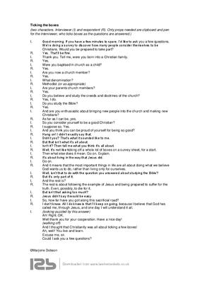 (two characters. Interviewer (I) and respondent (R). Only props needed are clipboard and pen