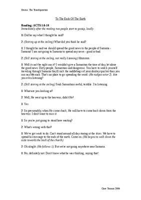 A short, lighthearted sketch about the transfiguration, based on Acts 1:6-14. It explores what it means to spread the good news to the 'ends of the earth' and considers how the disciples may have reacted to this instruction. It would be particularly useful for informal and all-age worship.