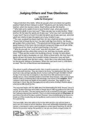 One picture is worth a thousand words. Here, in quick succession, are four of Jesus’ most vivid word-sketches. They are meant to be funny. Try reading them like that, and you’ll see a dry, perhaps typically Jewish, humour coming through; the Bible is full of humour if we know how to recognize it. But what these little scenes have to say is deadly serious. Jesus intended people to remember these lessons. They were going to need to. Each is a warning about rival teachings, rival visions of the kingdom, about ‘solutions’ which leave the depths of the problem untouched. They applied to rival teachings in Jesus’ day, but they apply just as well to some of today’s theories about what human life should be like...