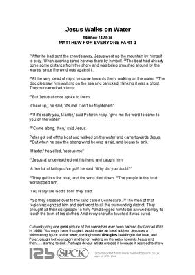 Curiously, only one great picture of this scene has ever been painted (by Conrad Witz in 1444). You might have thought it would make an ideal subject: Jesus as a shimmering figure on the water, the frightened disciples huddling in the boat, and Peter, caught between glory and terror, walking on the water towards Jesus and then . . . starting to sink. Perhaps devout artists avoided it because it seemed to show up the great apostle in a bad light. Personally, I find it all the more encouraging. It rings very true to the Christian experience I know, my own and that of many others...
