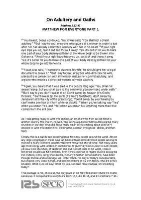 As I was getting ready to write this section, an email arrived from an old friend in another country. His church, he said, was facing a question that troubles a great many churches in our day. What did Jesus really mean in his teaching about divorce? I decided to write this section first, thinking the question through as I did so, and then reply.