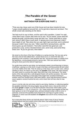 Our guide knew what he was doing. He had already asked a local fisherman to bring a small boat. Leaving us on the shore, he got in the boat, and they pushed off and rowed out to the middle of the inlet. Then he stood up in the boat, and in a clear voice, without needing to shout, he read to us this story, the parable of the sower. We were amazed. His voice came to us across the water, clear and crisp in the morning air. The steep banks of the inlet acted like a well-designed theatre with perfect acoustics. We stood there listening, imagining a crowd many times larger than ourselves listening to another voice from another boat 2,000 years before. Jesus had discovered a perfect way to speak to several hundred at once, and to have them all hear what he was saying...