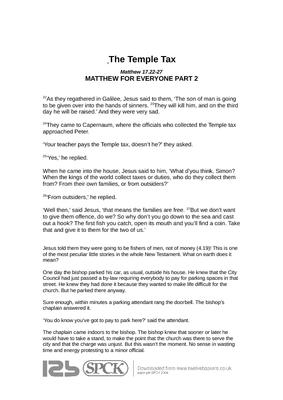 One day the bishop parked his car, as usual, outside his house. He knew that the City Council had just passed a by-law requiring everybody to pay for parking spaces in that street. He knew they had done it because they wanted to make life difficult for the church. But he parked there anyway.
