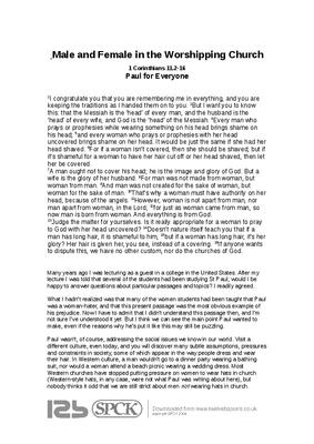 What I hadn’t realized was that many of the women students had been taught that Paul was a woman-hater, and that this present passage was the most obvious example of his prejudice. Now I have to admit that I didn’t understand this passage then, and I’m not sure I’ve understood it yet. But I think we can see the main point Paul wanted to make, even if the reasons why he’s put it like this may still be puzzling...